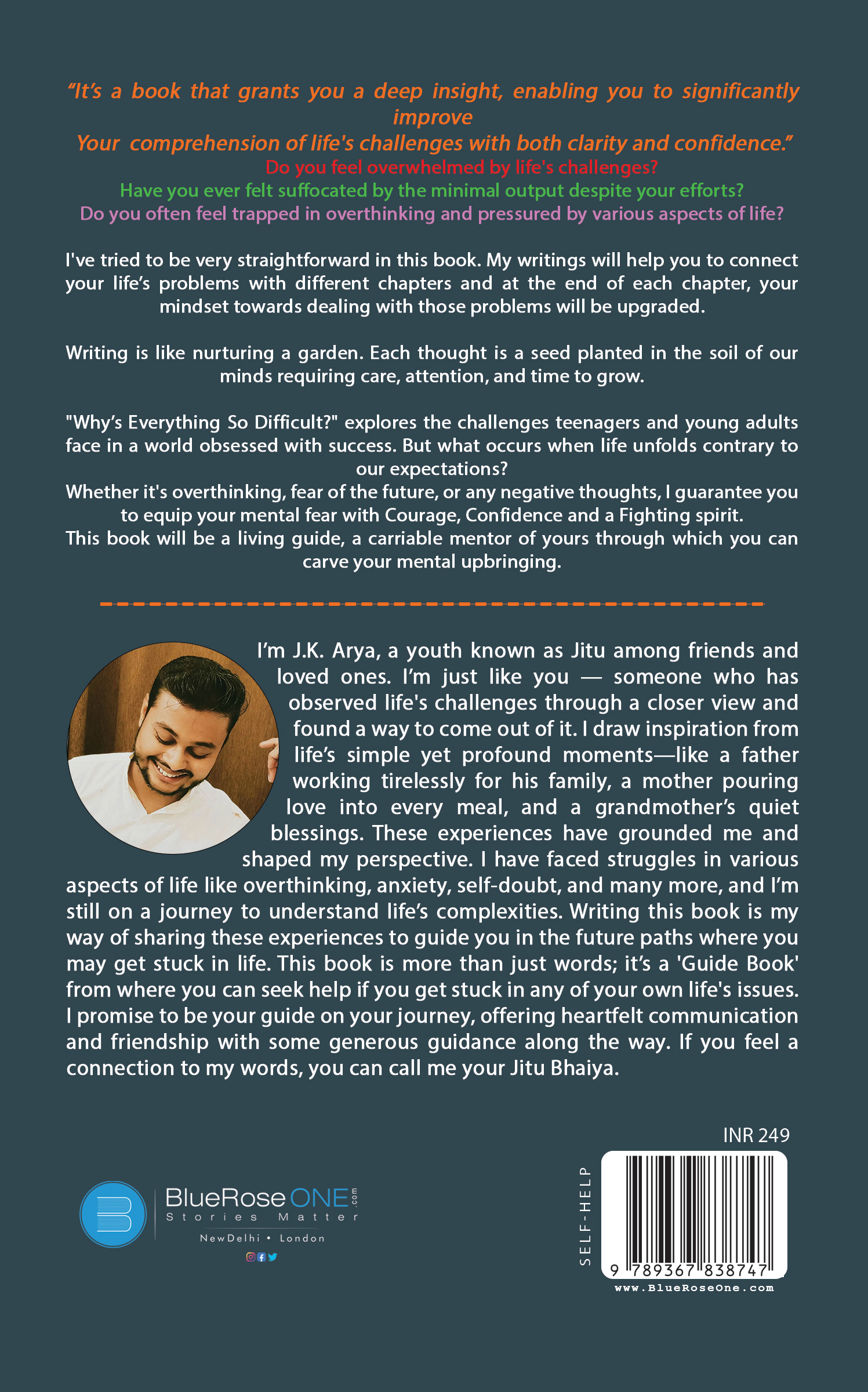 Through his personal experiences and keen insights, J.K. Arya has crafted this book that speaks directly to the heart of every young person asking, “Why is everything so difficult?” In these pages, he doesn’t just offer advice—he becomes your companion, guiding you through the complexities of youth with understanding, relatability, and a fresh perspective on life, if you feel the connection you can connect to him as your guiding friend, your well-wisher, Jitu Bhaiya.